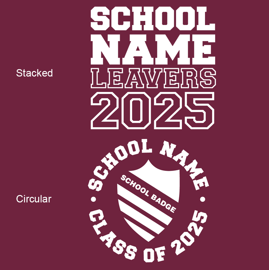 An alternative to the school logo. Custom text gives you more flexibility and is specific to the leavers cohort. These can be produced printed in either a stacked or circular design.