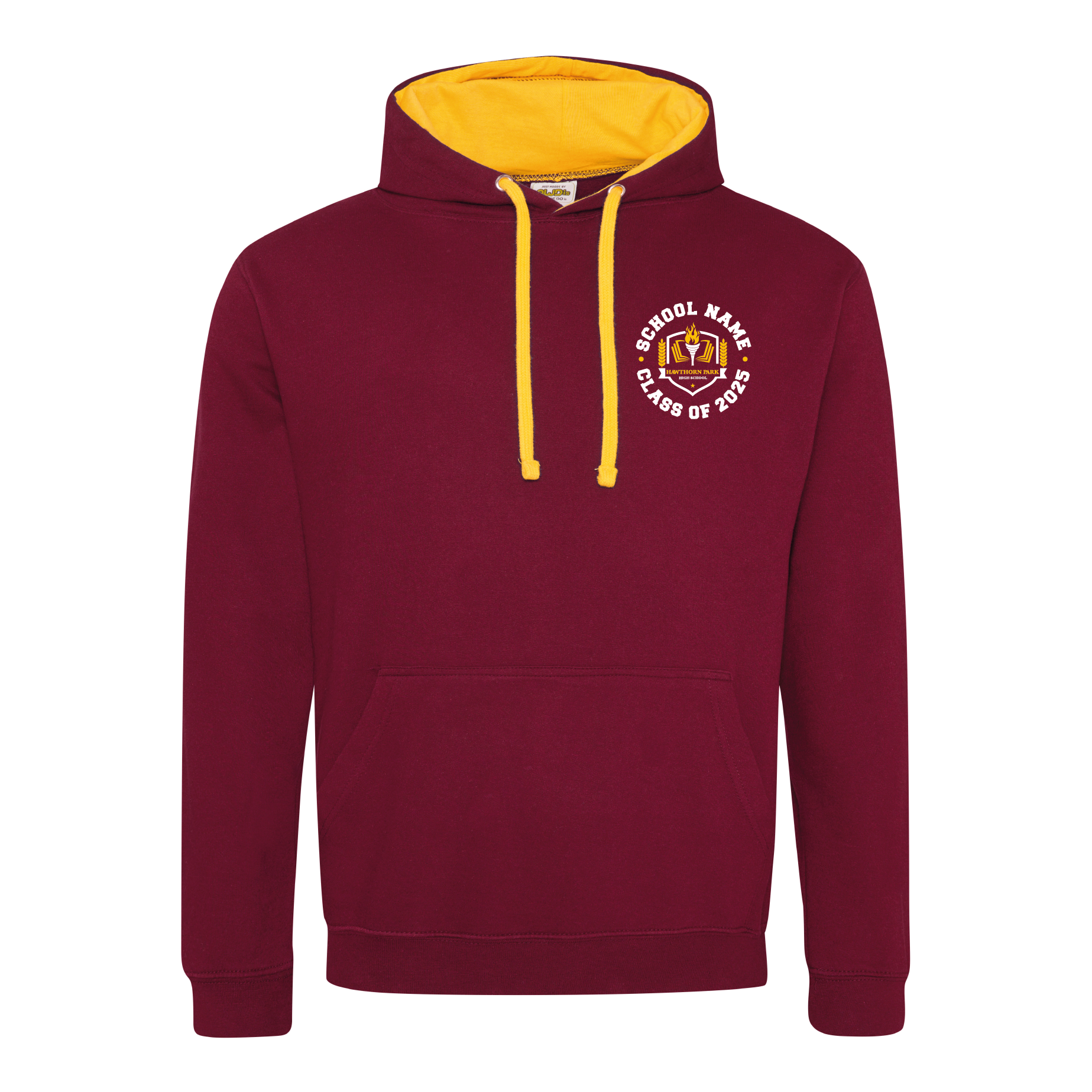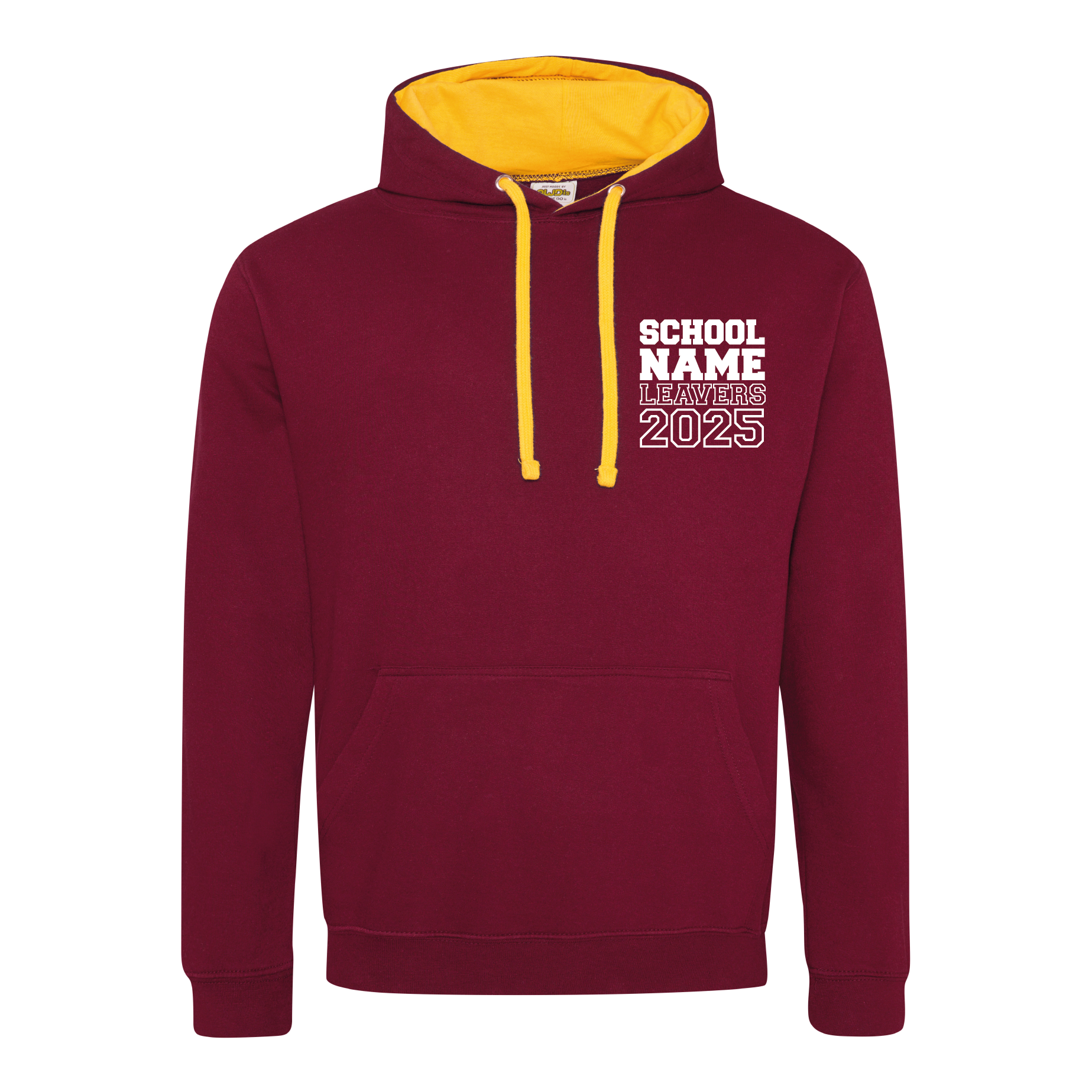 As an option schools often include decoration on the front of their leavers hoodies. This usually consists of a school logo or custom text, alongside optional individual initials.